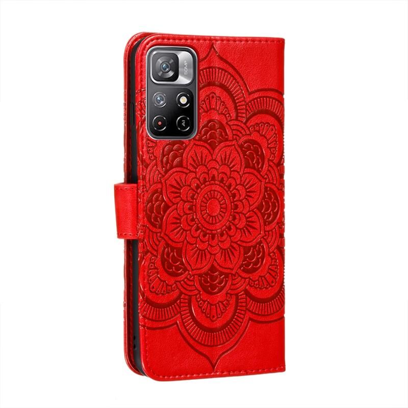 Για Xiaomi Redmi Note 11 Sun Mandala ανάγλυφο μοτίβο τηλέφωνο δερμάτινη θήκη με κάτοχο & υποδοχές για κάρτες & πορτοφόλι & κορδόνι (κόκκινο)