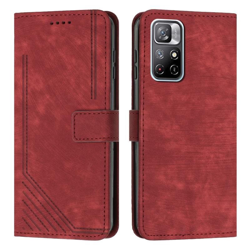 Για Xiaomi Redmi Note 11T 5G / Poco M4 Pro 5G δέρμα αίσθηση Stripe μοτίβο δερμάτινη θήκη τηλεφώνου με κορδόνι (κόκκινο)