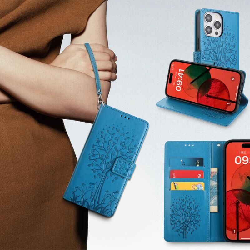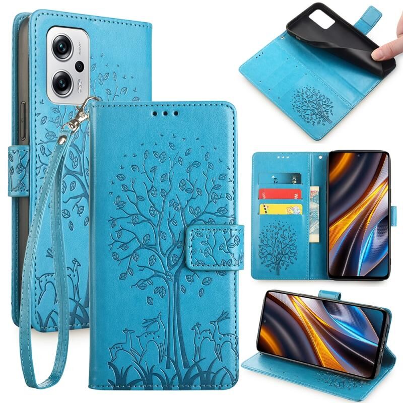 Θήκη τηλεφώνου δερμάτινη ανάγλυφη με σχέδια δέντρου και ελαφιού για Xiaomi Redmi Note 11T Pro+ 5G (Μπλε)