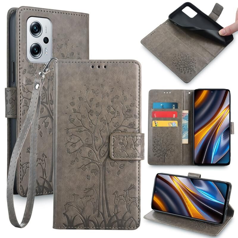 Θήκη τηλεφώνου δερμάτινη ανάγλυφη με σχέδια δέντρου και ελαφιού για Xiaomi Redmi Note 11T Pro 5G (Μπλε)