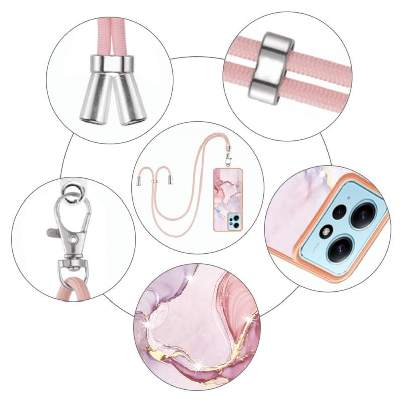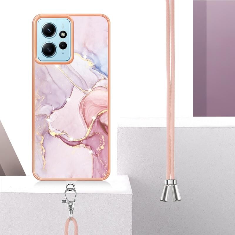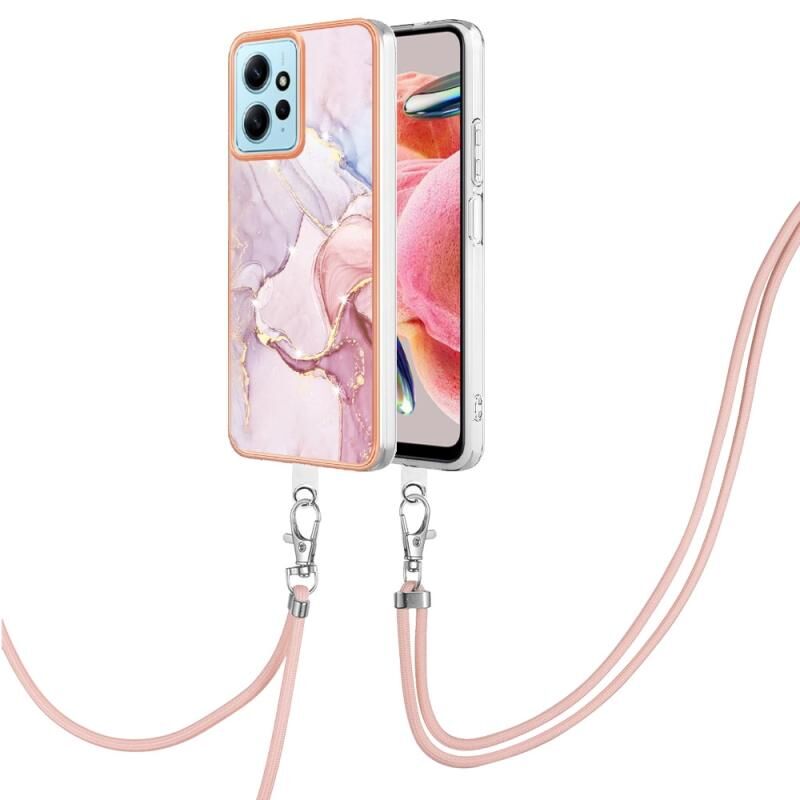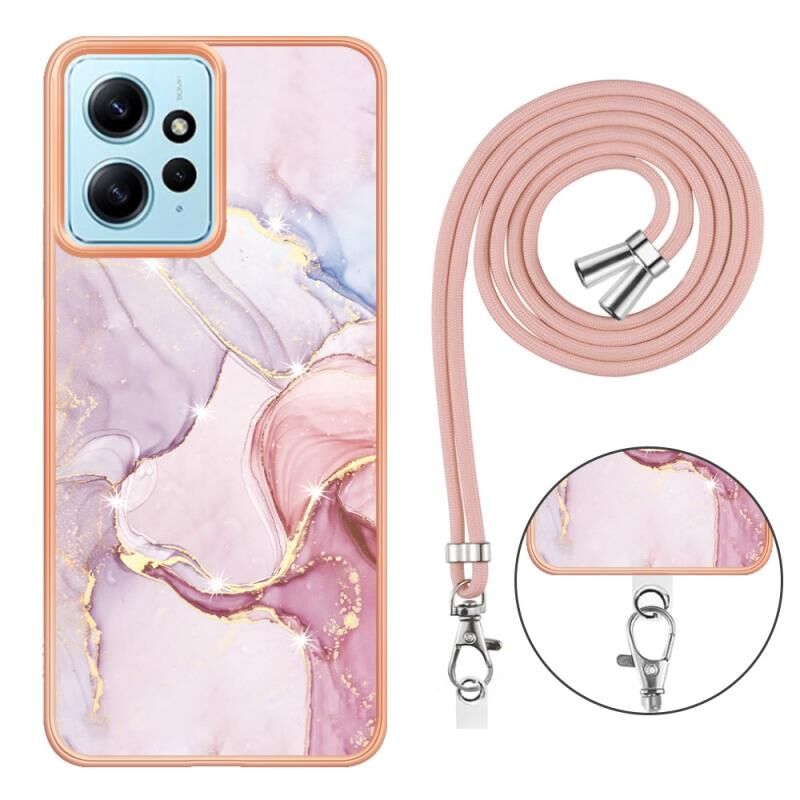 Για Xiaomi Redmi Note 12 4G Global Θήκη Τηλεφώνου με Επιμετάλλωση Μαρμάρου Διπλής Όψης IMD με Λουρί (Ροζ Χρυσός 005)