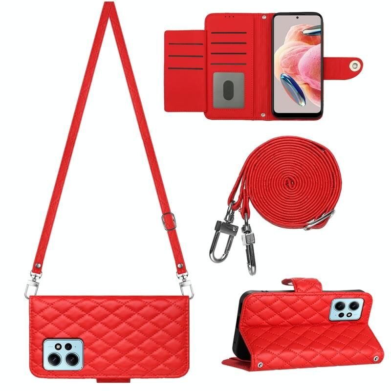 Για Xiaomi Redmi Note 12 4G Global Rhombic υφή Flip δέρμα τηλέφωνο υπόθεση με μακρύ κορδόνι (κόκκινο)