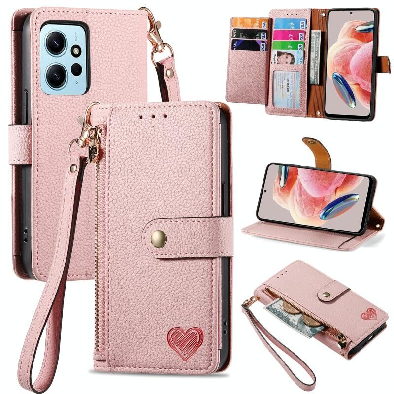 Για Xiaomi Redmi Σημείωση 12 4G αγάπη φερμουάρ Lanyard δέρμα τηλέφωνο υπόθεση (ρόζ)