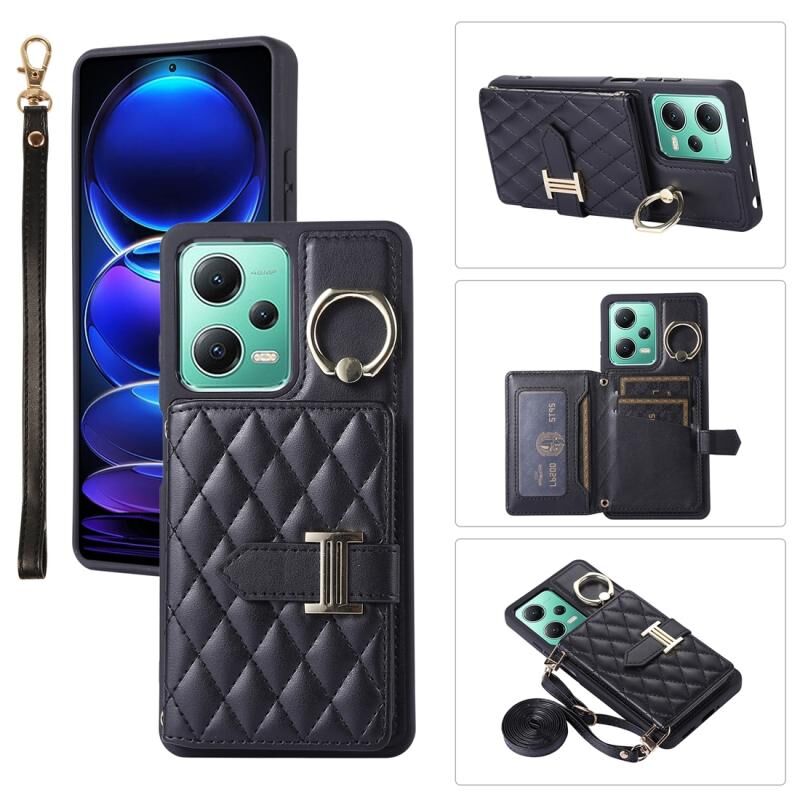 Για Xiaomi Redmi Σημείωση 12 5G Οριζόντια κάρτα τσάντα δαχτυλίδι κάτοχος τηλέφωνο υπόθεση με διπλή κορδόνι (μαύρο)
