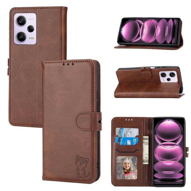 Για Xiaomi Redmi Σημείωση 12 Pro + 5G Παγκόσμια ανάγλυφο Happy Cat μοτίβο Flip δέρμα τηλέφωνο υπόθεση (καφέ)