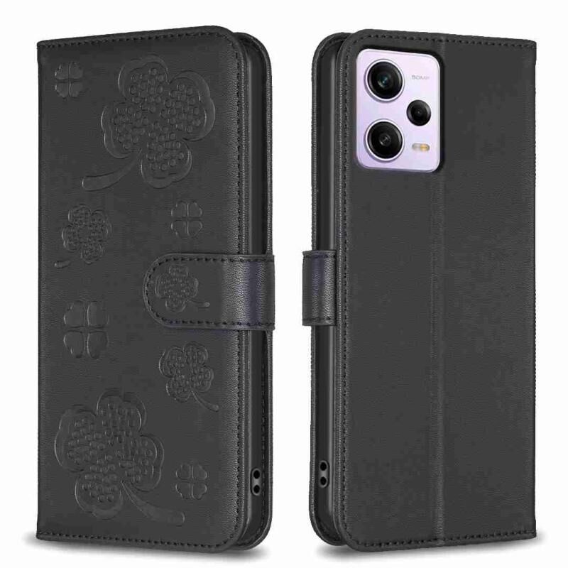 Για Xiaomi Redmi Note 12 Pro 5G Global Four-leaf ανάγλυφη δερμάτινη θήκη τηλεφώνου (Μαύρο)