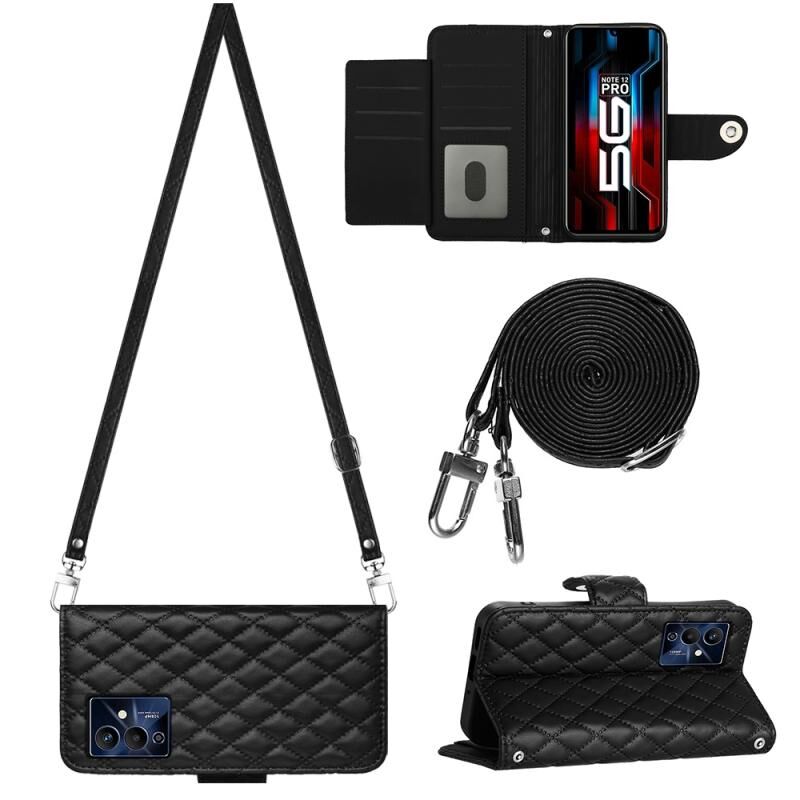 Για Xiaomi Redmi Note 12 Pro 5G Global Rhombic Texture Flip δερμάτινη θήκη τηλεφώνου με μακρύ κορδόνι (Μαύρο)