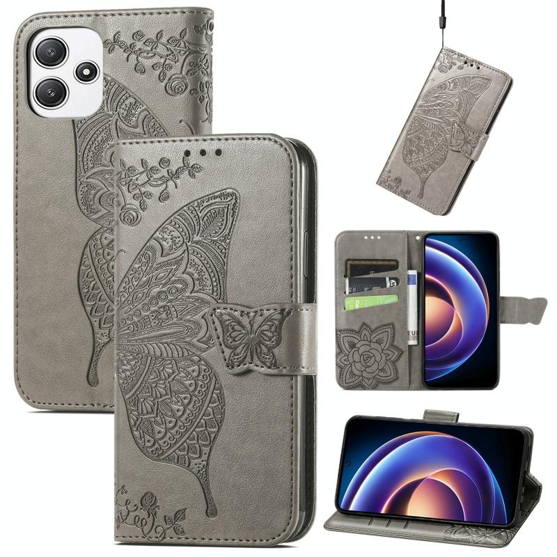 For Xiaomi Redmi Note 12R Butterfly Love Flower Embossed Leather Phone Case(Gray)