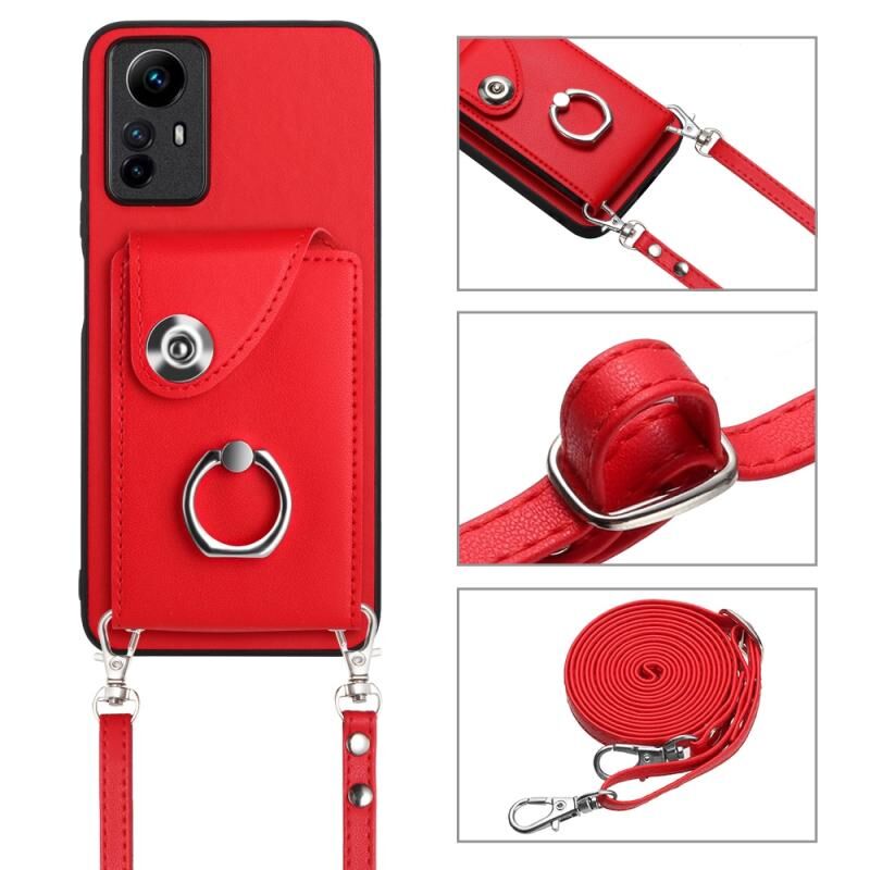 Για Xiaomi Redmi Σημείωση 12S 4G Global Organ Card τσάντα τσάντα δαχτυλίδι κάτοχος τηλέφωνο υπόθεση με μακρύ κορδόνι (κόκκινο)