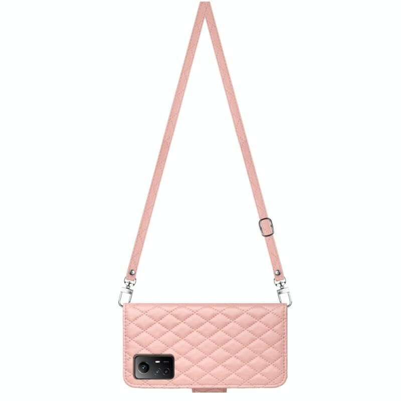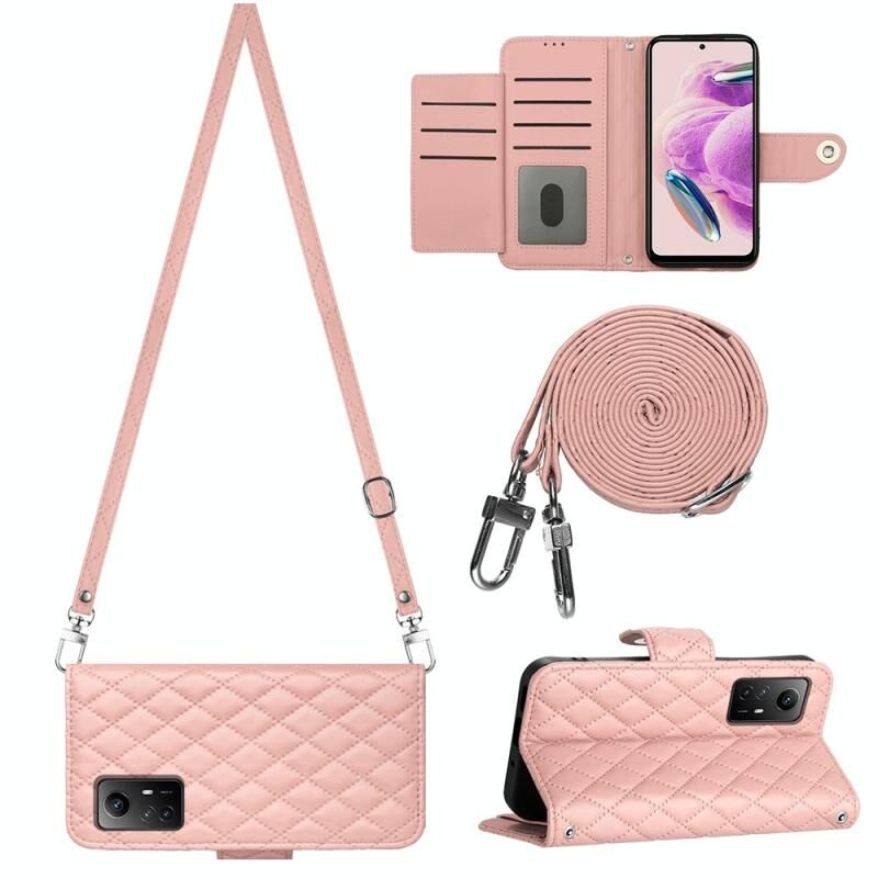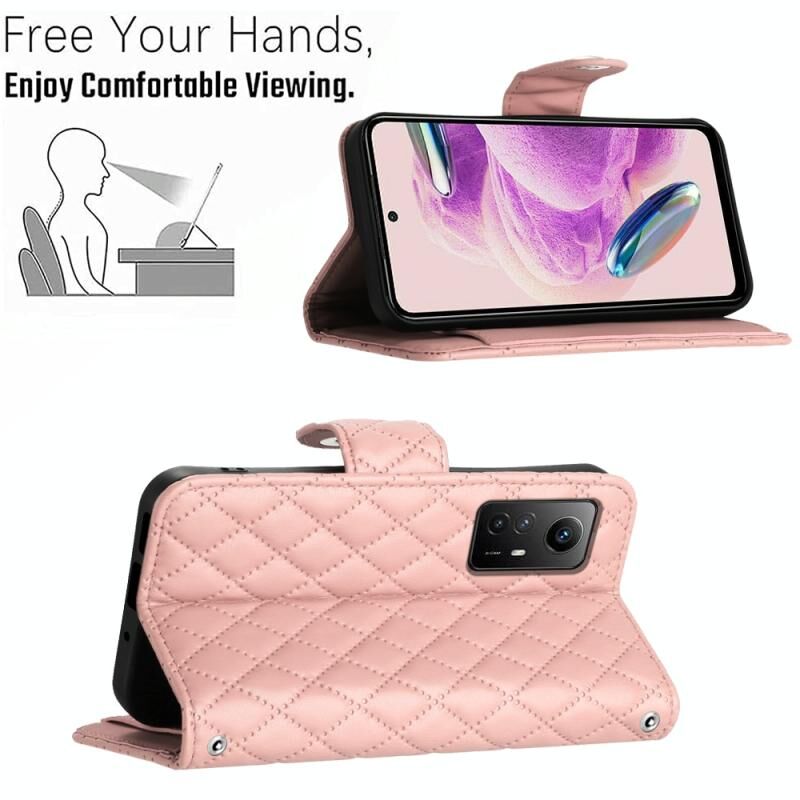 Για Xiaomi Redmi Note 12S 4G Global Rhombic υφή Flip δέρμα τηλέφωνο υπόθεση με μακρύ κορδόνι (Coral Pink)