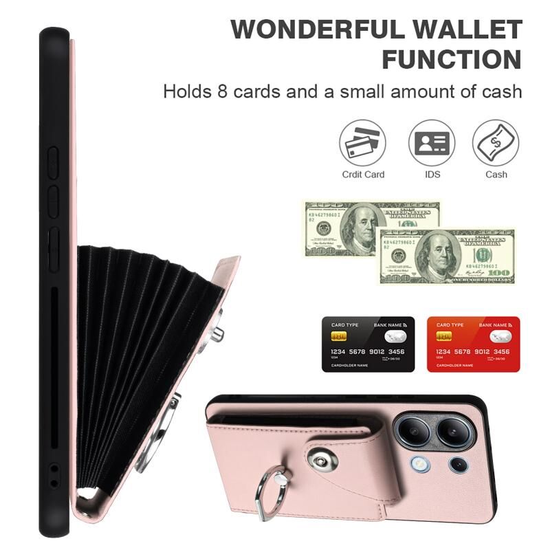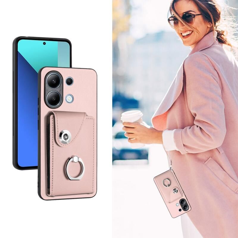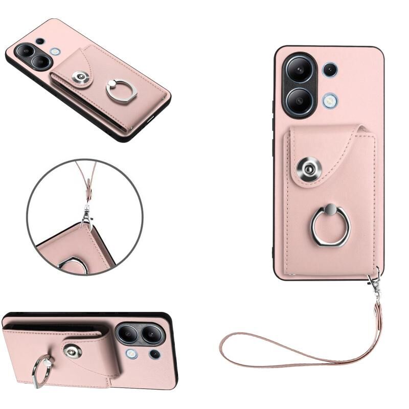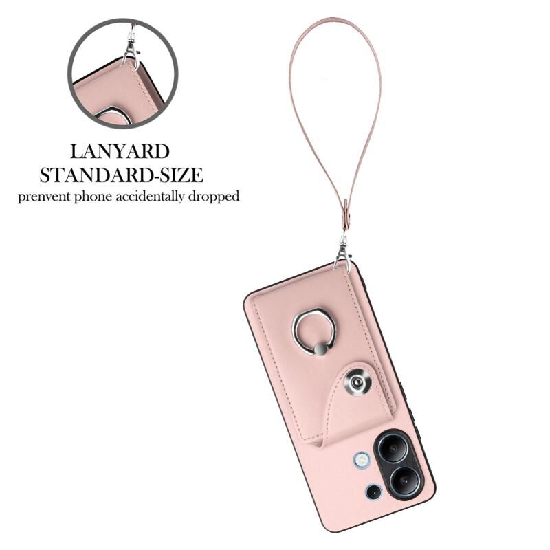 Για Xiaomi Redmi Σημείωση 13 4G Παγκόσμια Οργανική κάρτα τσάντα δαχτυλίδι κάτοχος PU υπόθεση τηλεφώνου με κορδόνι (ροζ)