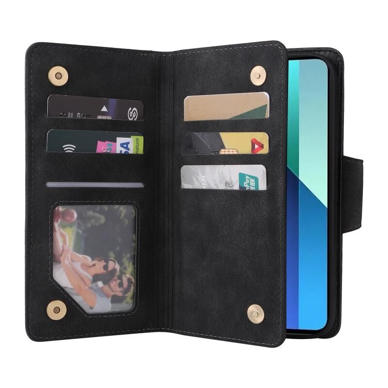 Για Xiaomi Redmi Note 13 4G Rivet πόρπη 9 κάρτες τρεις φορές δερμάτινη θήκη τηλεφώνου (μαύρο)