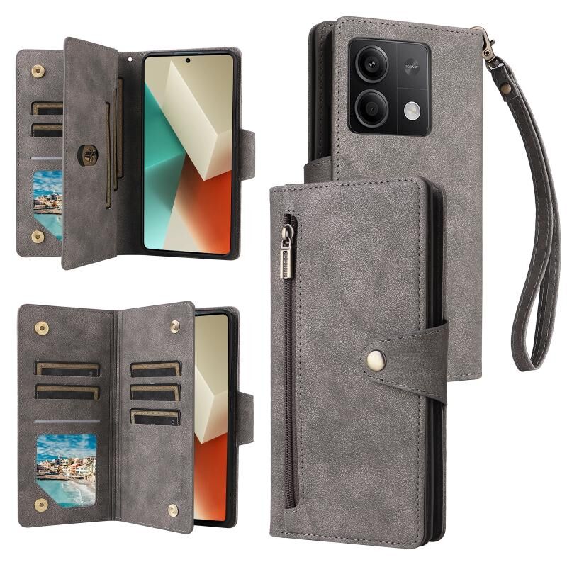 Για Xiaomi Redmi Note 13 5G Rivet πόρπη 9 κάρτες τρεις φορές δερμάτινη θήκη τηλεφώνου (γκρι)