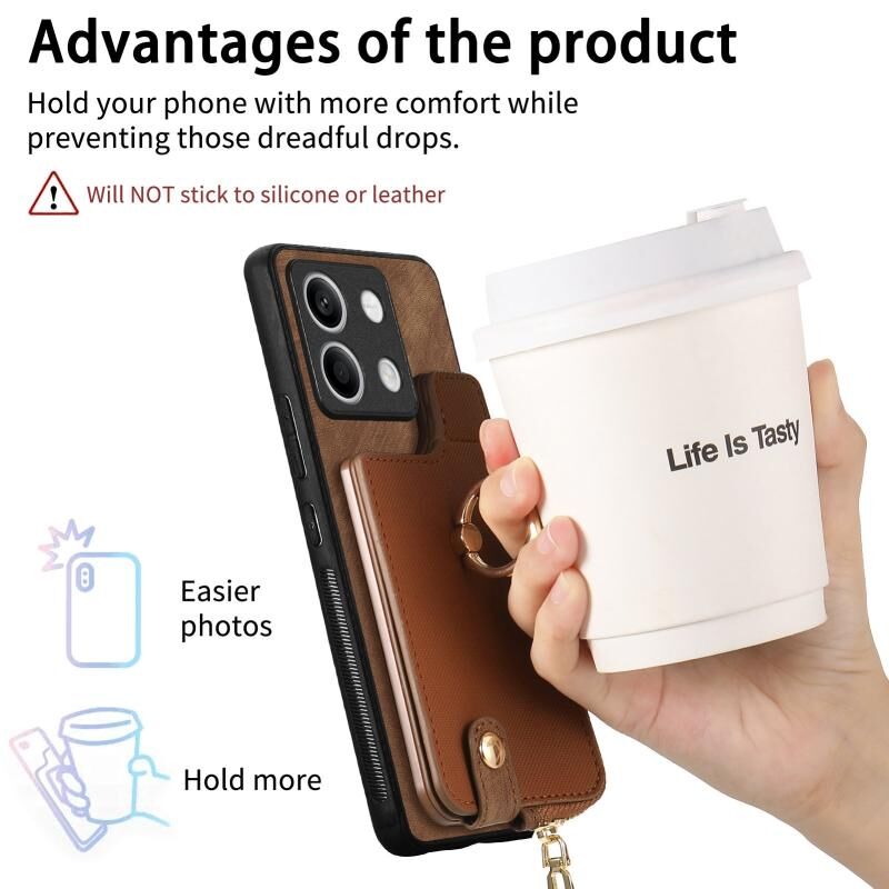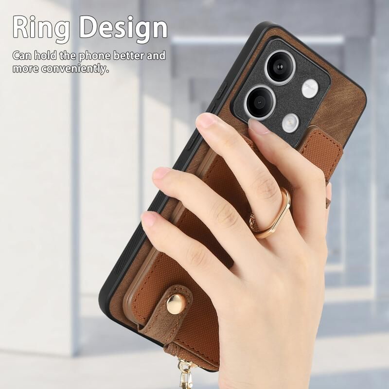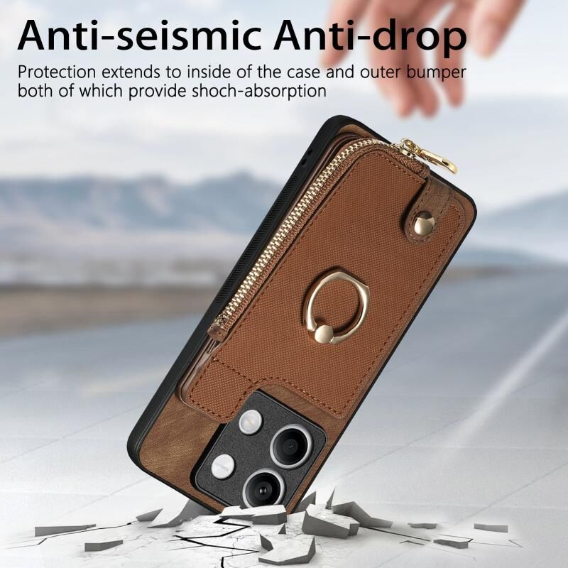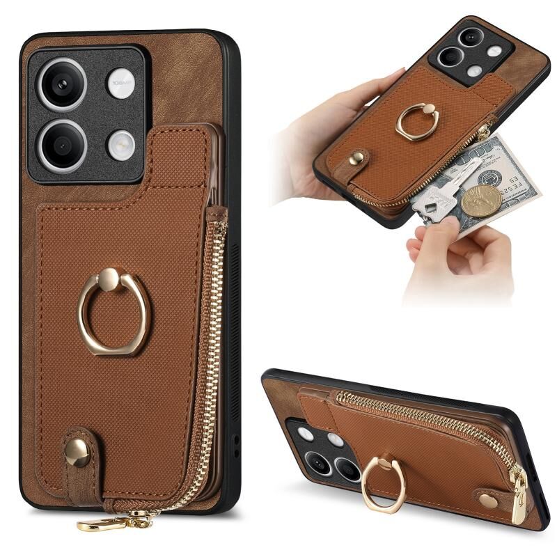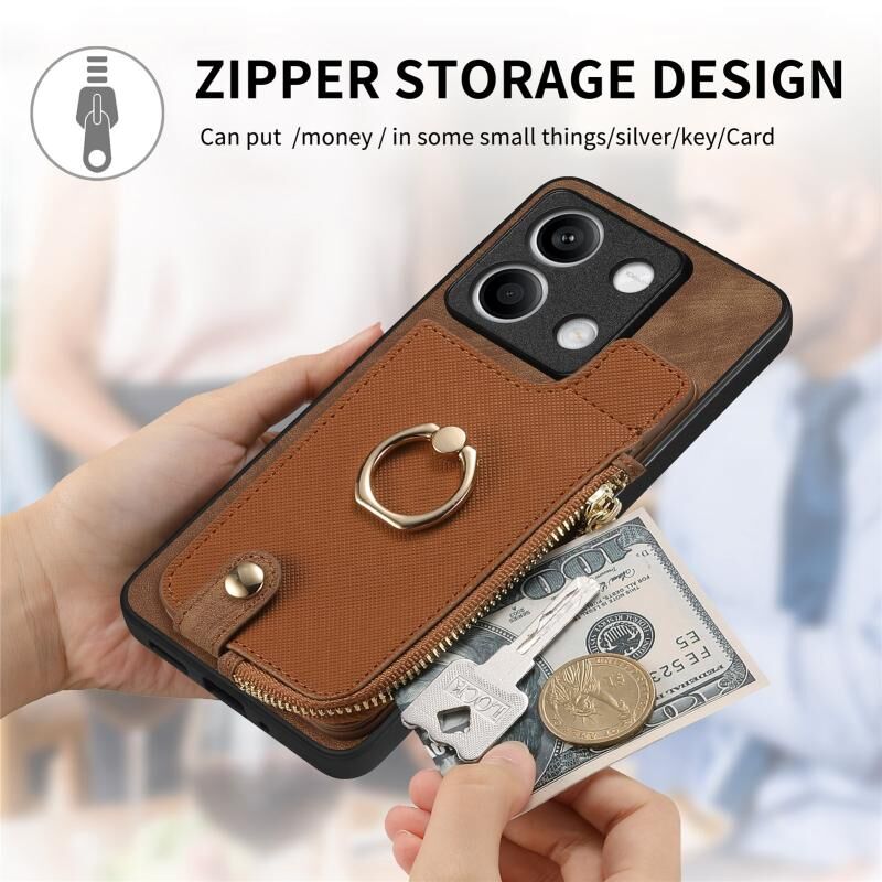 Για Xiaomi Redmi Note 13 Cross Δερμάτινο δαχτυλίδι κάθετη φερμουάρ πορτοφόλι πίσω υπόθεση τηλεφώνου (καφέ)