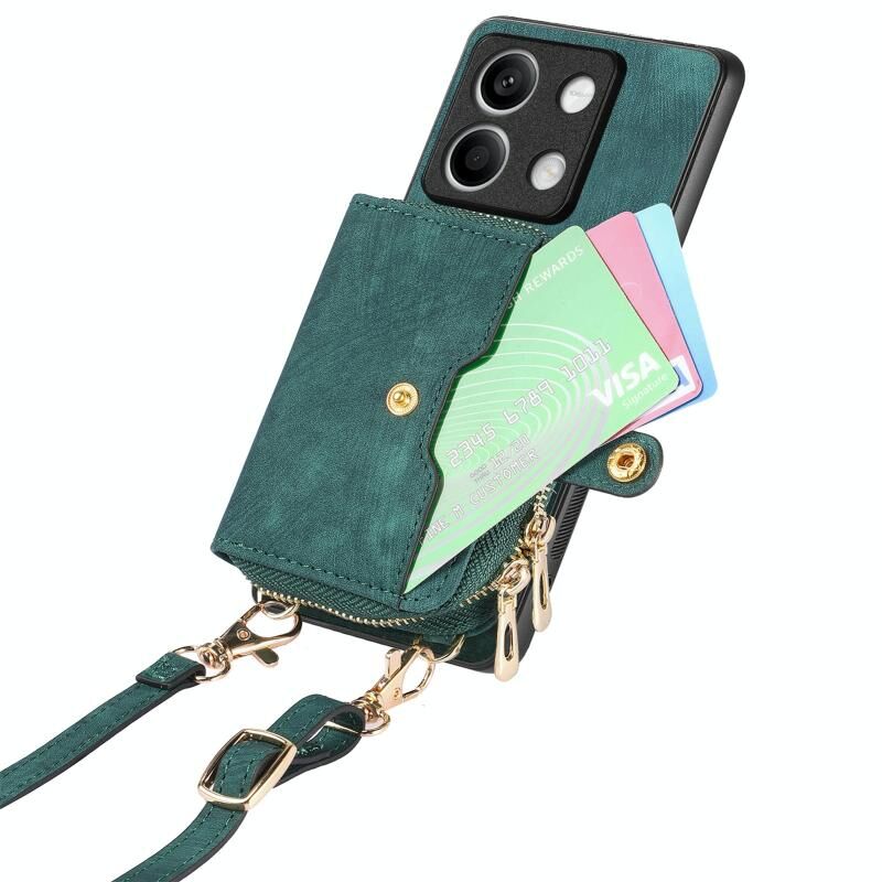 Για Xiaomi Redmi Note 13 Crossbody Multi-λειτουργία φερμουάρ πορτοφόλι τηλέφωνο υπόθεση (πράσινο)
