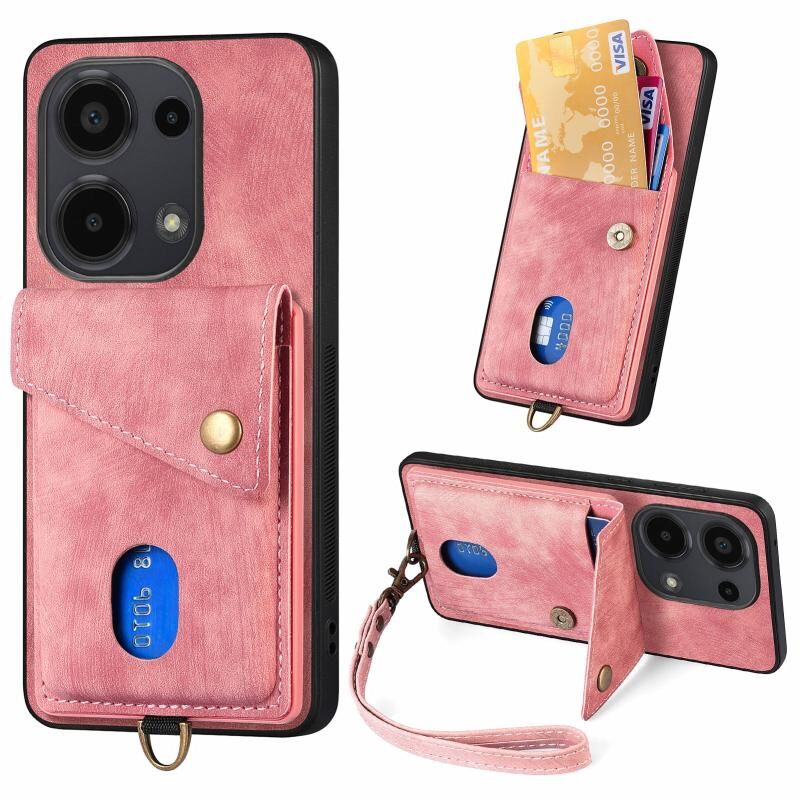 Για Xiaomi Redmi Note 13 Pro 4G Ρετρό κάρτα πορτοφόλι πτυσσόμενο δερμάτινη θήκη τηλεφώνου με λουράκι (ρόζ)