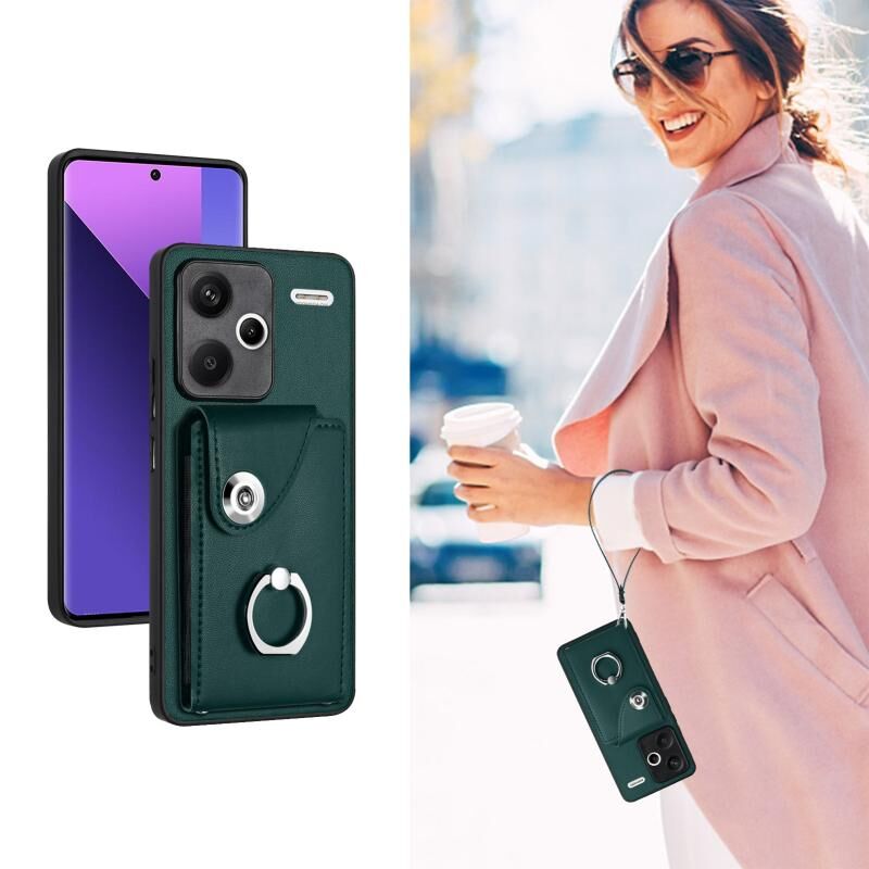 Για Xiaomi Redmi Note 13 Pro + Οργανική κάρτα τσάντα δαχτυλίδι κάτοχος PU υπόθεση τηλεφώνου με κορδόνι (πράσινο)