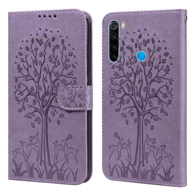 Θήκη τηλεφώνου από δέρμα με σχέδιο δέντρου και ελαφιού, τύπου flip, για Xiaomi Redmi Note 8 2021 (Μωβ)