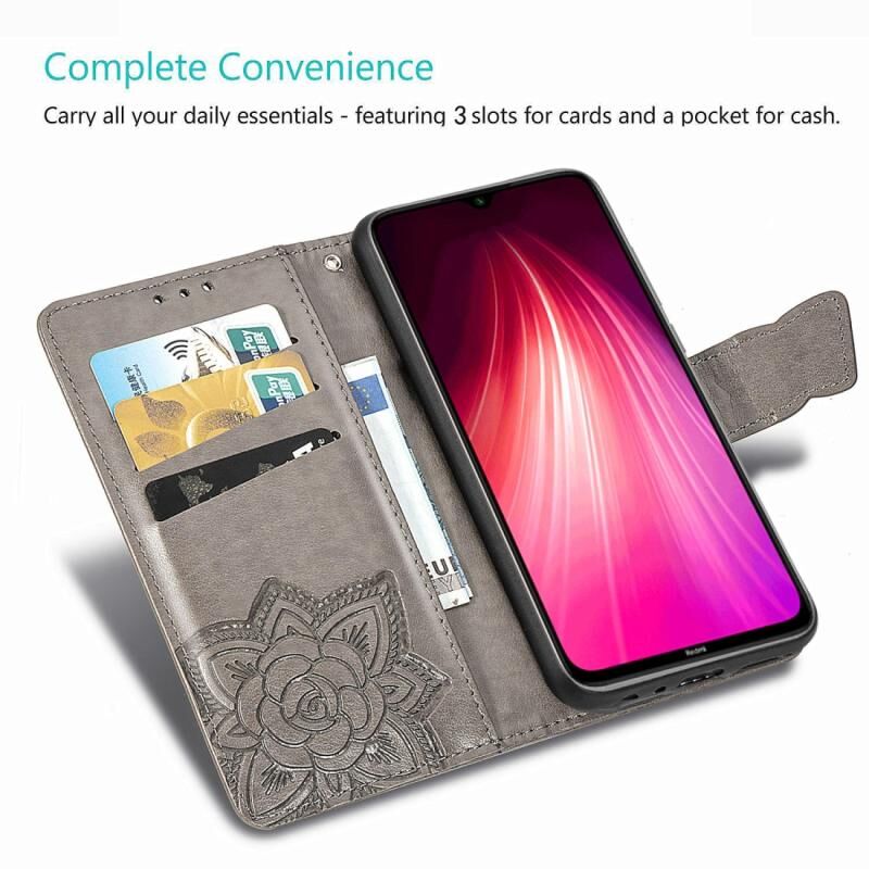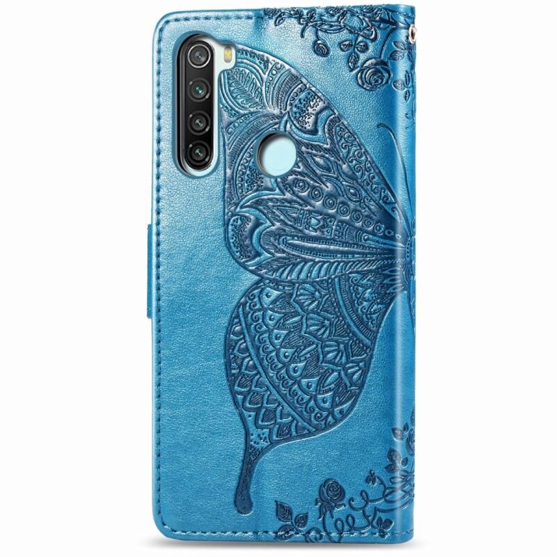 Θήκη δέρματος οριζόντιας αναδίπλωσης για Xiaomi Redmi Note 8 με ανάγλυφο σχέδιο πεταλούδας και λουλουδιών, με βάση στήριξης / υποδοχή κάρτας / πορτοφόλι / κορδόνι (Μπλε)