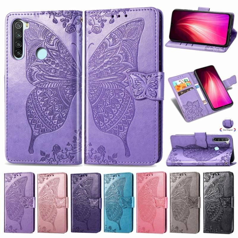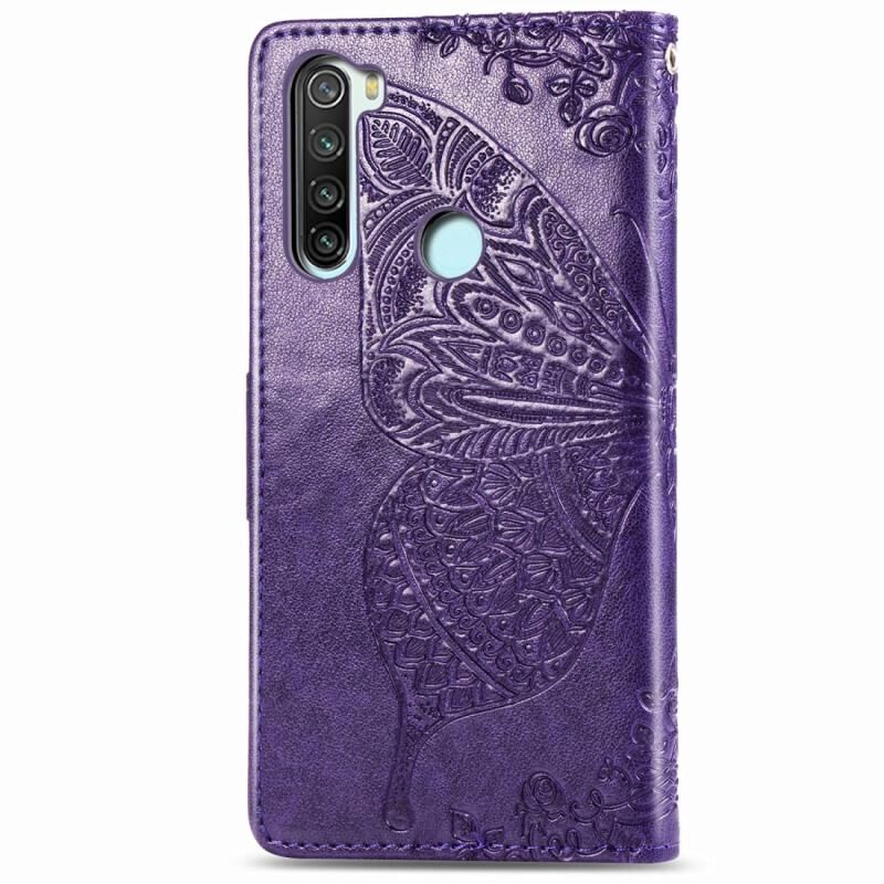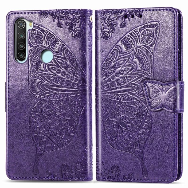 Θήκη δέρματος οριζόντιας αναδίπλωσης για Xiaomi Redmi Note 8 με ανάγλυφο σχέδιο πεταλούδας και λουλουδιών, με βάση στήριξης / υποδοχή κάρτας / πορτοφόλι / κορδόνι (Σκούρο Μωβ)