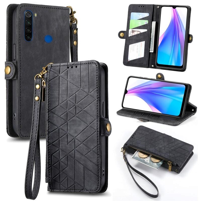 Για Xiaomi Redmi Note 8T γεωμετρική φερμουάρ πορτοφόλι πλευρά πόρπη δερμάτινη θήκη τηλεφώνου (μαύρο)