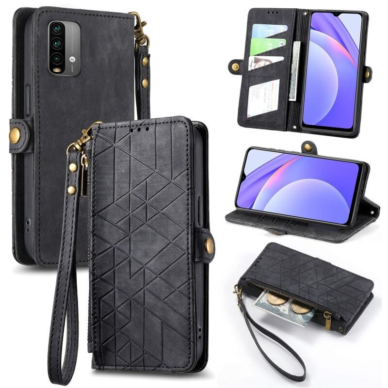 Για Xiaomi Redmi Note 9 4G γεωμετρική φερμουάρ πορτοφόλι πλευρά πόρπη δερμάτινη θήκη τηλεφώνου (Μαύρο)