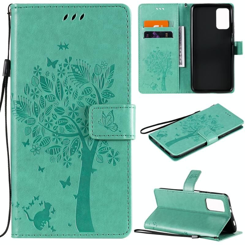 Θήκη για Xiaomi Redmi Note 9 4G με σχέδιο Δέντρου & Γάτας, εκτυπωμένη με θερμοτύπηση, οριζόντια αναδιπλούμενη από δερματίνη PU με βάση στήριξης & θήκες για κάρτες & πορτοφόλι & κορδόνι (Πράσινο)