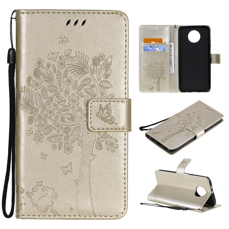Θήκη για Xiaomi Redmi Note 9 5G με σχέδιο Δέντρου & Γάτας, εκτυπωμένη με θερμοτύπωση, οριζόντια αναδιπλούμενη από δερματίνη PU με βάση στήριξης & θήκες καρτών & πορτοφόλι & κορδόνι (Πράσινο)
