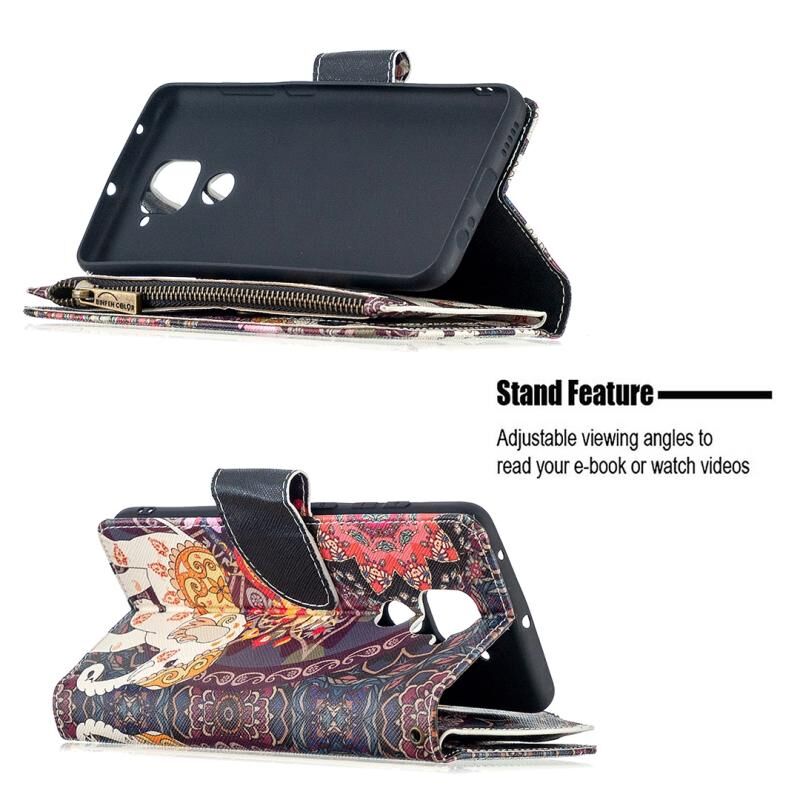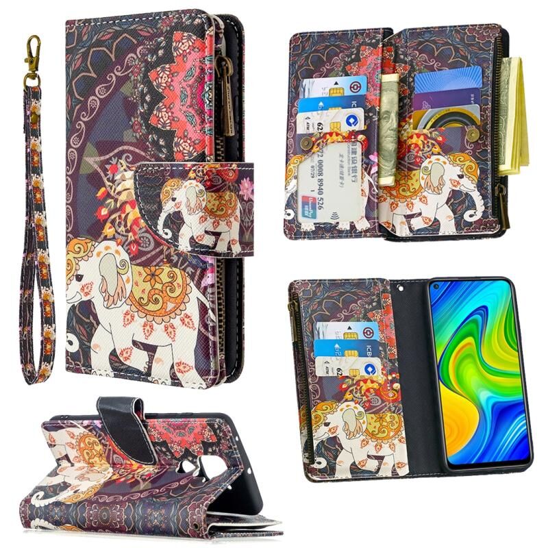 Θήκη δέρματος οριζόντιας αναδίπλωσης με φερμουάρ και σχέδια για Xiaomi Redmi Note 9, με βάση για κάρτες και πορτοφόλι (Λουλούδια και Ελέφαντες). (Κόκκινο)