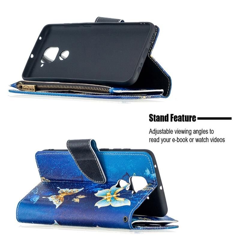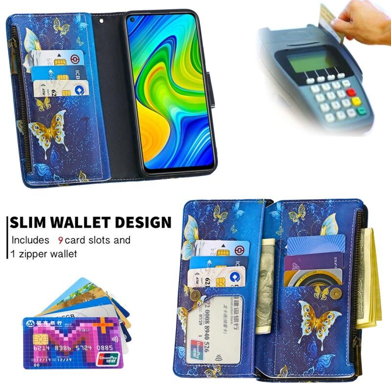 Θήκη δέρματος οριζόντιας αναδίπλωσης με φερμουάρ και σχέδιο ζωγραφικής για Xiaomi Redmi Note 9 με βάση για κάρτες και πορτοφόλι (Χρυσή Πεταλούδα)