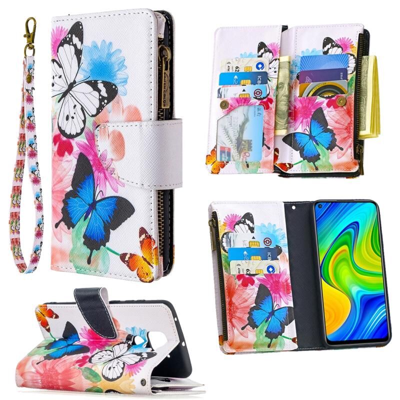 Θήκη δέρματος οριζόντιας αναδίπλωσης με φερμουάρ και σχέδιο ζωγραφικής για Xiaomi Redmi Note 9 με βάση για κάρτες και πορτοφόλι (Δύο Πεταλούδες)