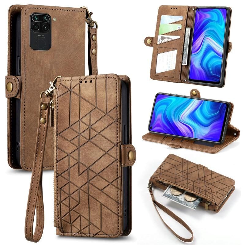 Για Xiaomi Redmi Note 9 γεωμετρική φερμουάρ πορτοφόλι πλευρά πόρπη δερμάτινη θήκη τηλεφώνου (καφέ)