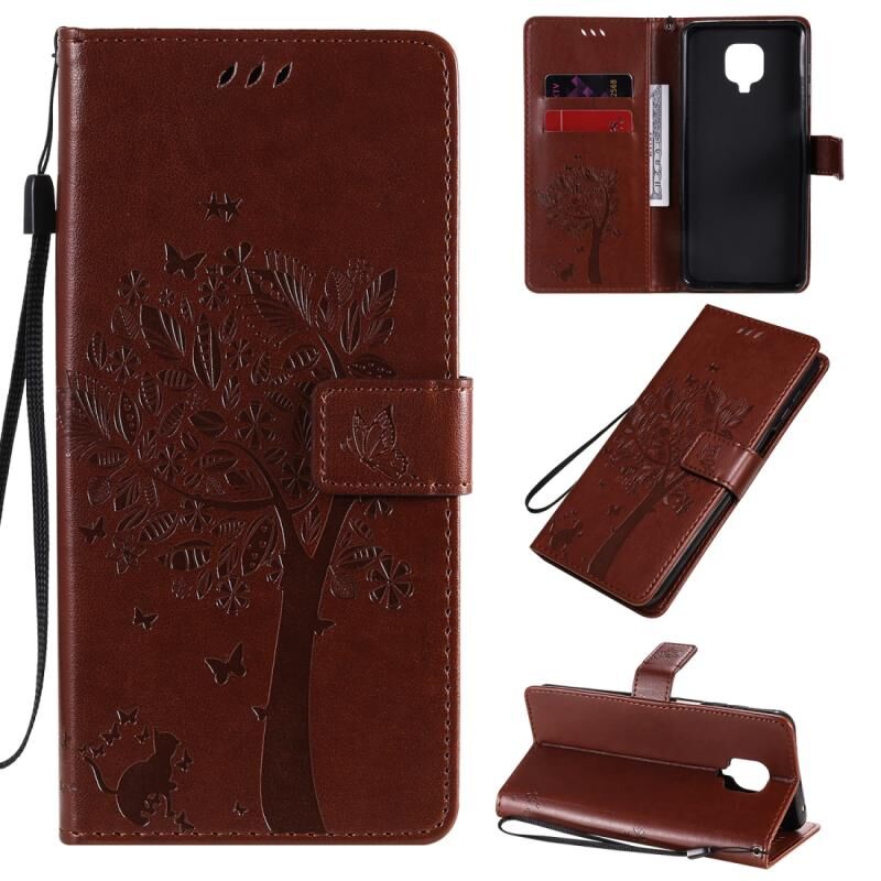 Για Xiaomi Redmi Note 9 Pro Tree & Cat ανάγλυφο μοτίβο οριζόντια Flip δερμάτινη θήκη με θήκη & υποδοχές για κάρτες & πορτοφόλι & κορδόνι (Καφέ)
