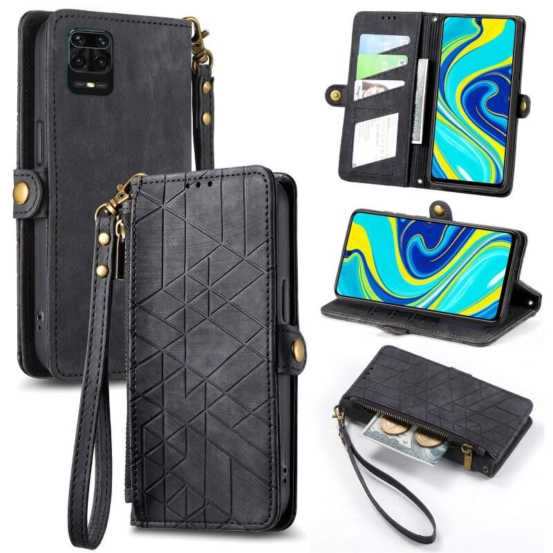 Για Xiaomi Redmi Note 9S γεωμετρική φερμουάρ πορτοφόλι πλευρά πόρπη δερμάτινη θήκη τηλεφώνου (μαύρο)