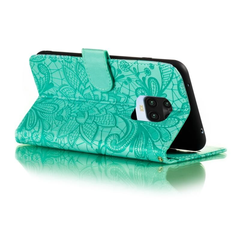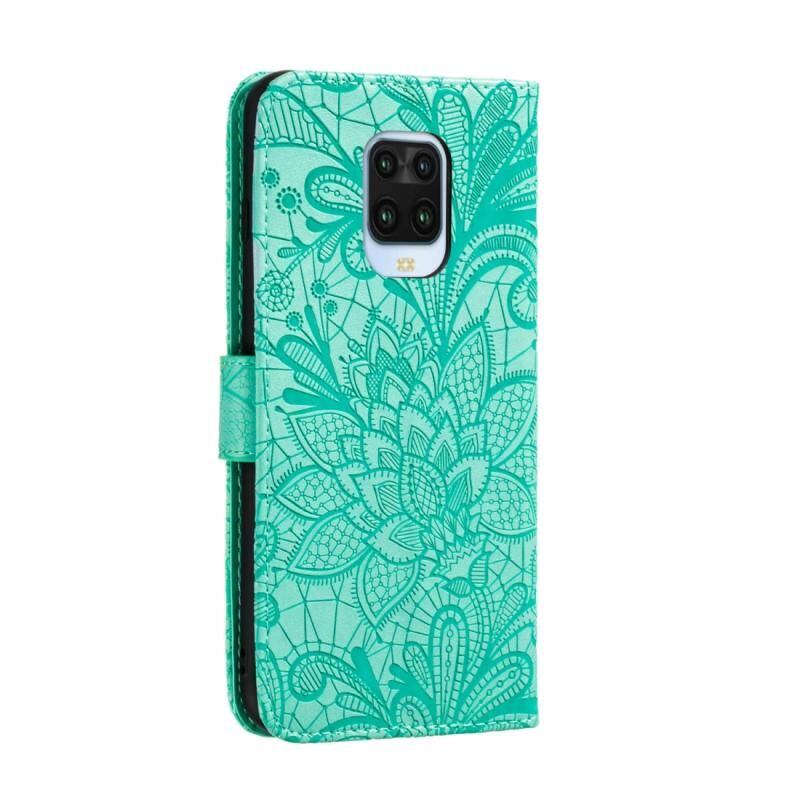 Θήκη δέρματος οριζόντιας αναδίπλωσης με δαντελένια λουλουδάτα ανάγλυφα για Xiaomi Redmi Note 9S, με βάση & υποδοχές καρτών & πορτοφόλι & κορνίζα φωτογραφιών & κορδόνι (πράσινο)