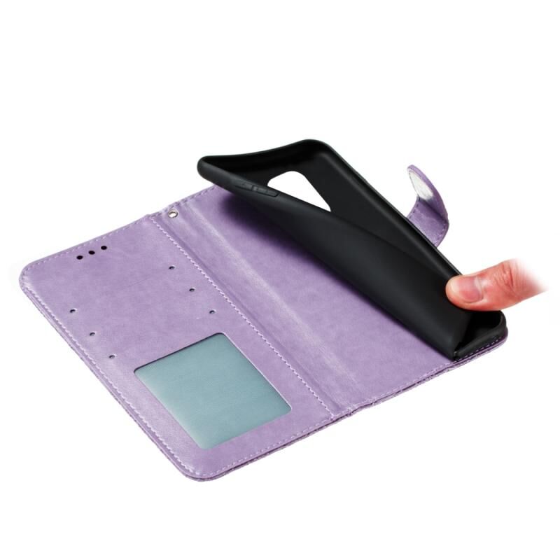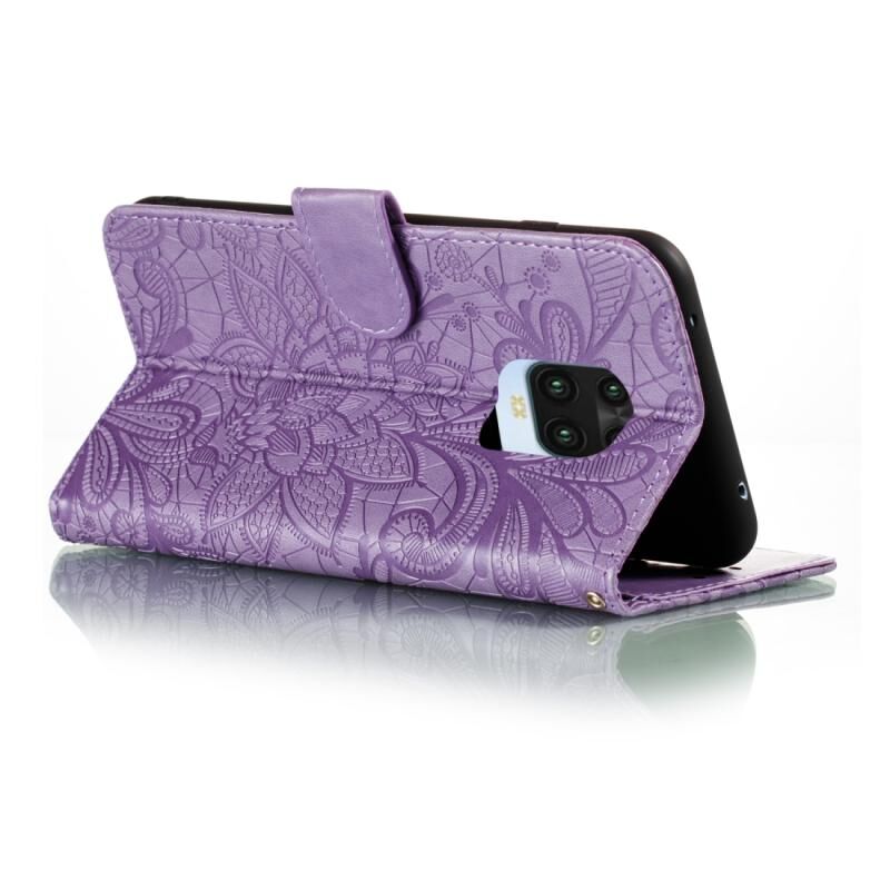 Θήκη δέρματος οριζόντιας αναδίπλωσης με δαντελένια λουλουδάτα ανάγλυφα για Xiaomi Redmi Note 9S, με βάση & υποδοχές καρτών & πορτοφόλι & κορνίζα φωτογραφιών & κορδόνι (Μωβ)
