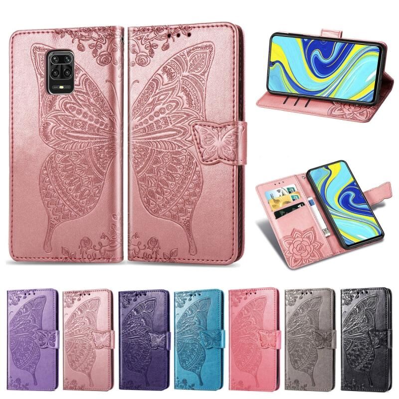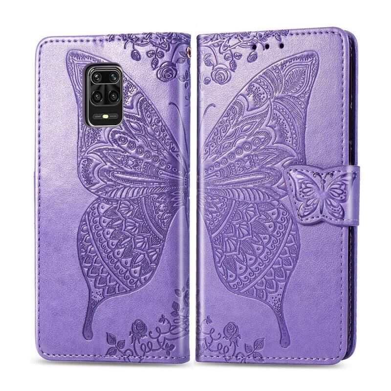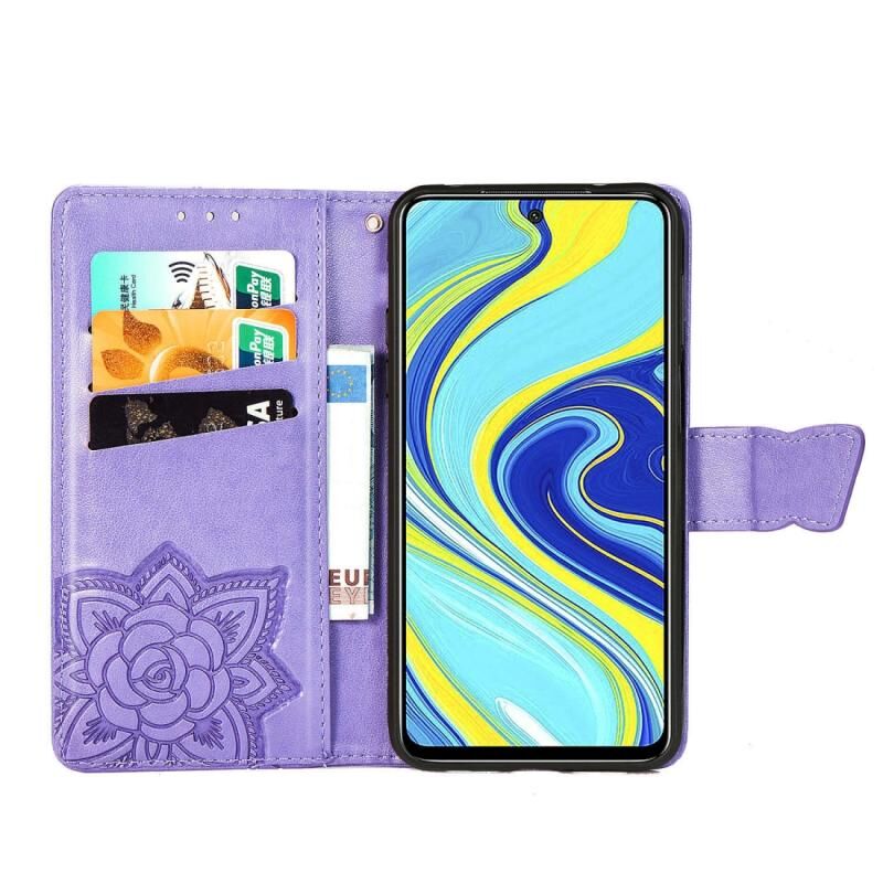 Θήκη δέρματος οριζόντιας αναδίπλωσης με σχέδιο πεταλούδας και λουλουδιών, ανάγλυφη, για Xiaomi Redmi Note 9S/Note 9 Pro/Note 9 Pro Max με βάση στήριξης / υποδοχή κάρτας / πορτοφόλι / κορδόνι (ανοιχτό μωβ)