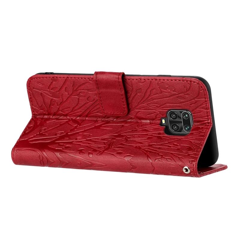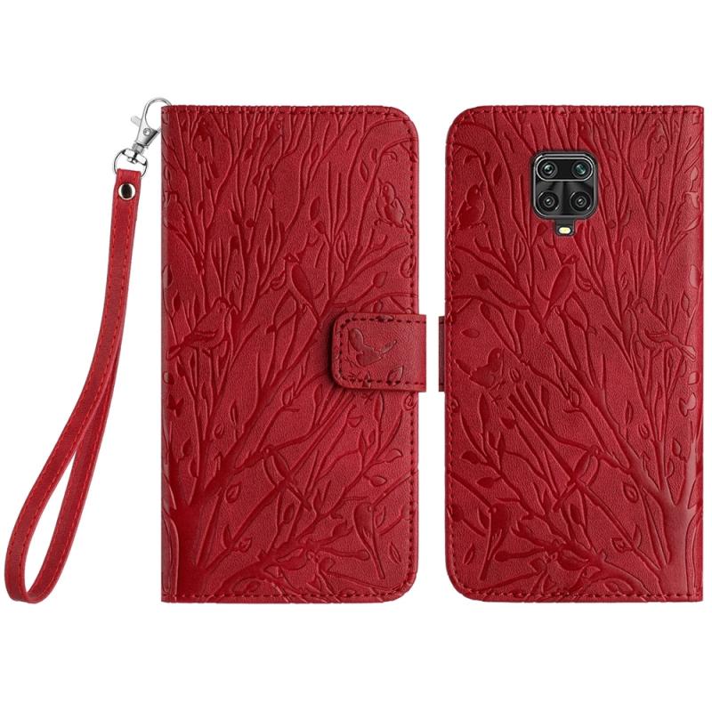 Θήκη δερμάτινη με ανάγλυφο σχέδιο δέντρων και πουλιών για Xiaomi Redmi Note 9S (Κόκκινο)