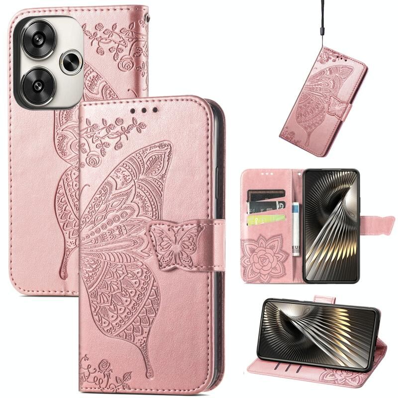 Θήκη τηλεφώνου από δέρμα με ανάγλυφο σχέδιο πεταλούδας και λουλουδιών για Xiaomi Redmi Turbo 3 5G (Χρυσό Ρόδι)