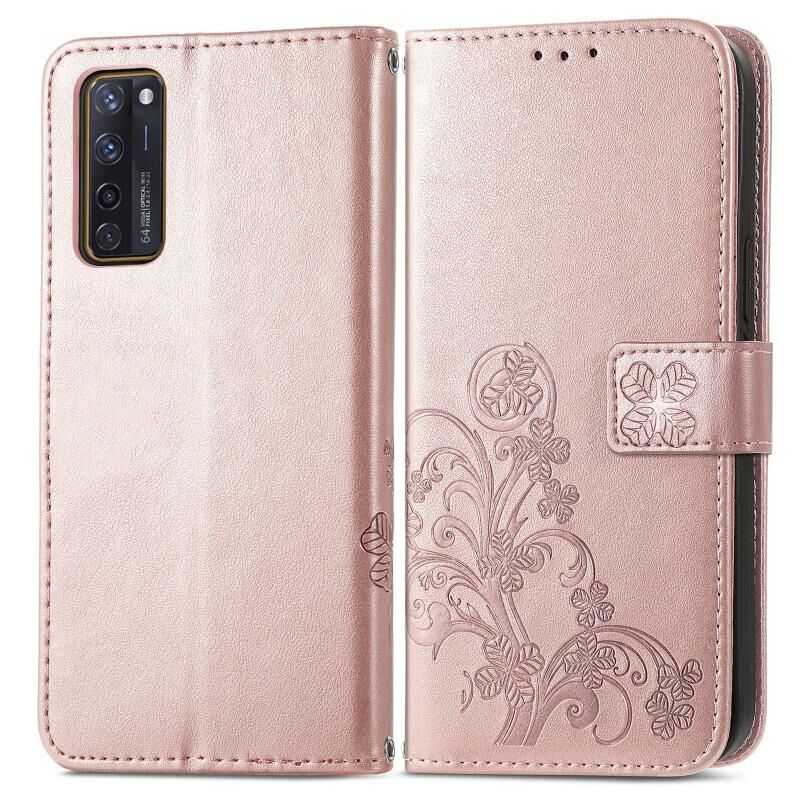Για ZTE AXON 20 5G Four-leaf Clasp ανάγλυφη αγκράφα Κινητό τηλέφωνο προστασία δερμάτινη θήκη με κορδόνι & υποδοχή για κάρτες & πορτοφόλι & βραχίονα λειτουργία (Rose Gold)