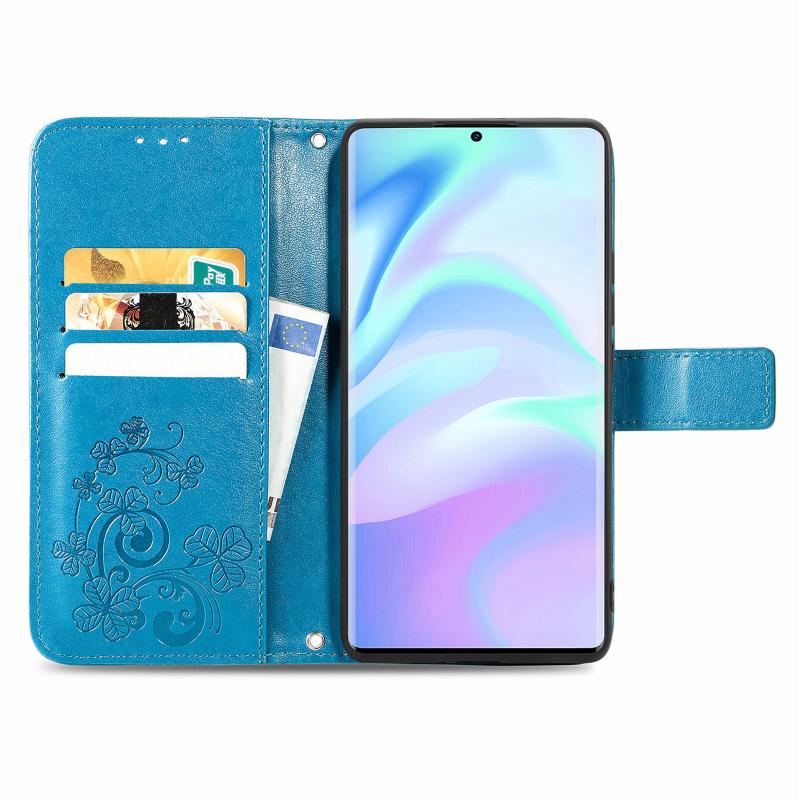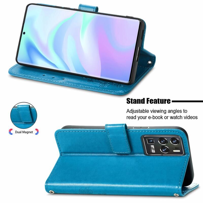 For ZTE Axon 30 Ultra 5G Four-leaf Clasp Embossed Buckle Mobile Phone Protection Leather Case with Lanyard & Card Slot & Wallet & Bracket Function(Blue)