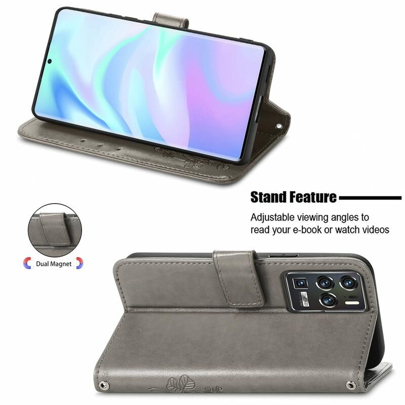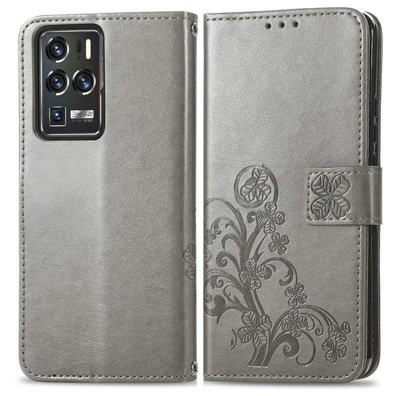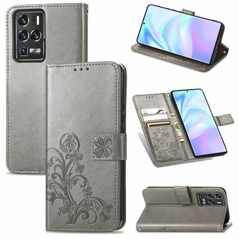 For ZTE Axon 30 Ultra 5G Four-leaf Clasp Embossed Buckle Mobile Phone Protection Leather Case with Lanyard & Card Slot & Wallet & Bracket Function(Gray)