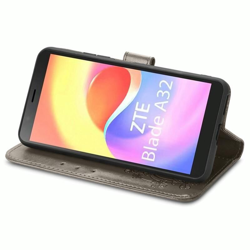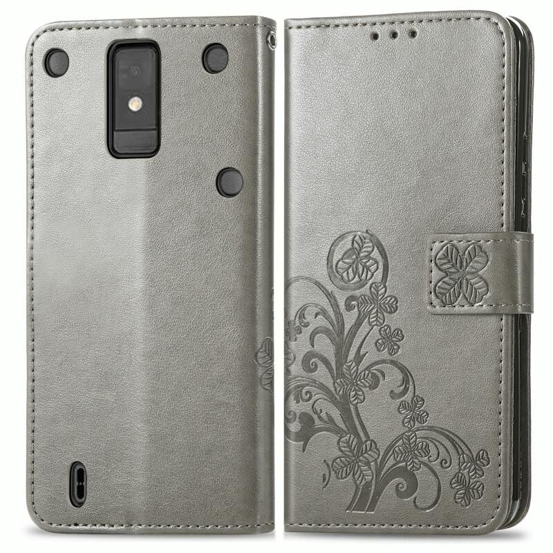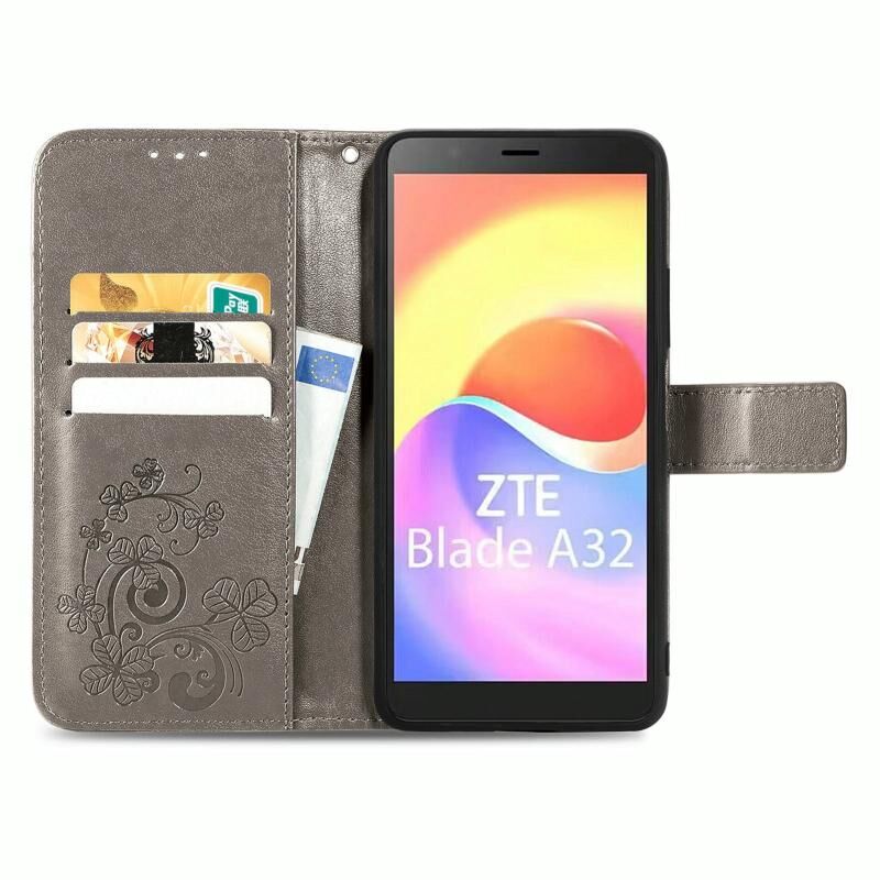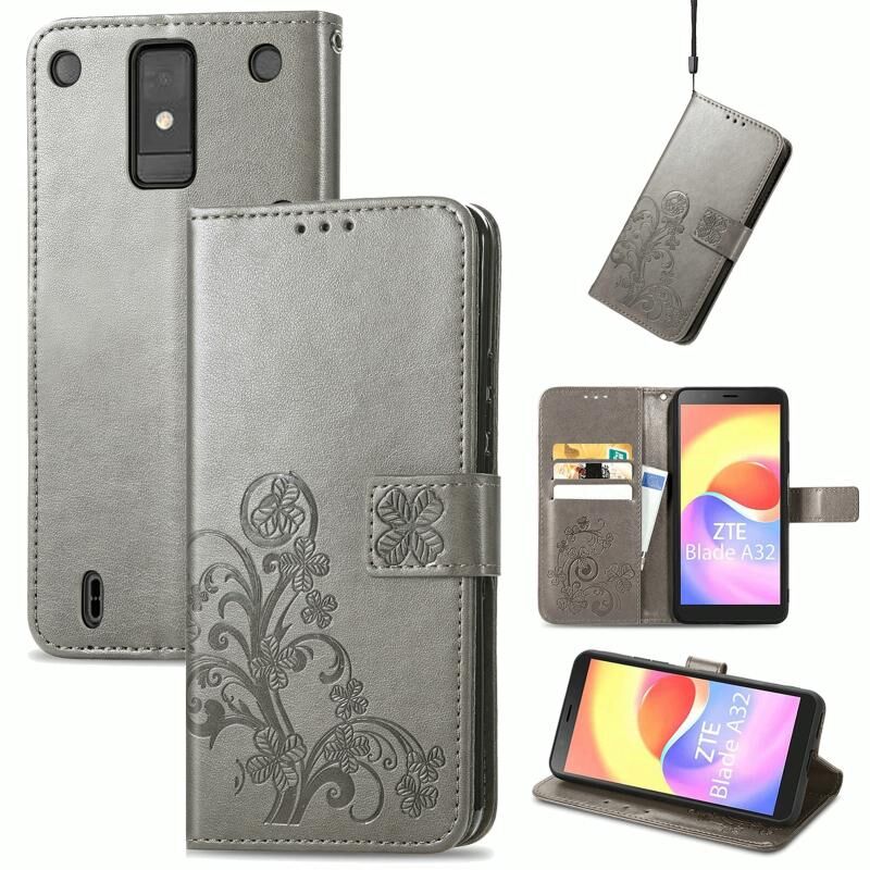 Για ZTE Blade A32 τετράφυλλο κούμπωμα ανάγλυφο αγκράφα δερμάτινη θήκη τηλεφώνου (γκρι)