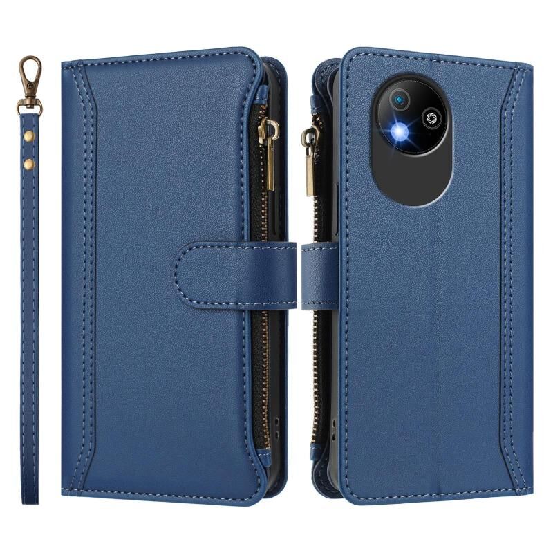 For ZTE Blade A35 Lite / A35 Core Magnetic Closure 9 Card Slots Zipper Leather Case with Hand Strap(Dark Blue)