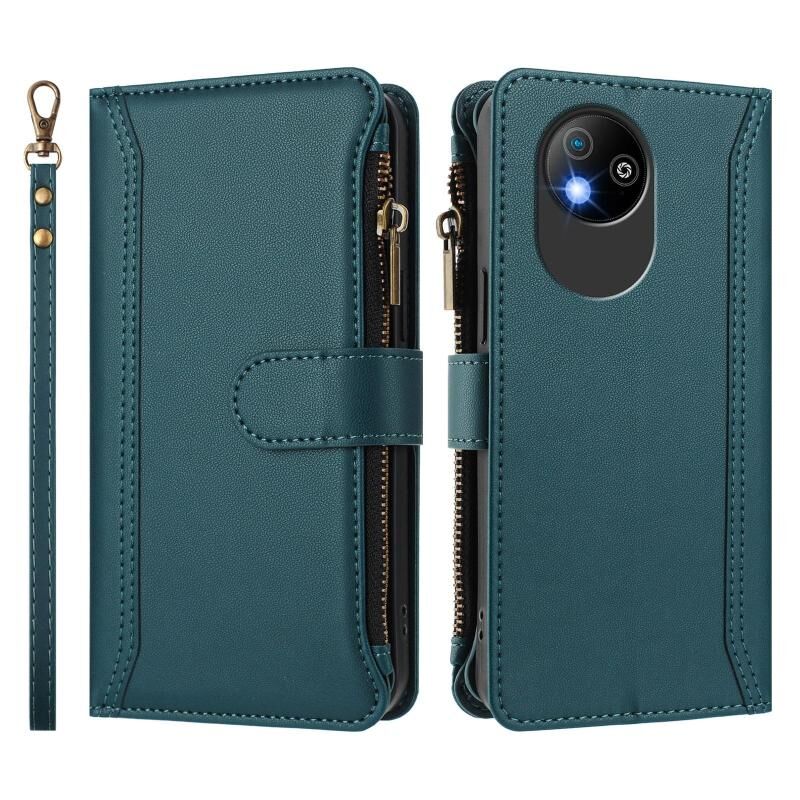 For ZTE Blade A35 Lite / A35 Core Magnetic Closure 9 Card Slots Zipper Leather Case with Hand Strap(Dark Green)