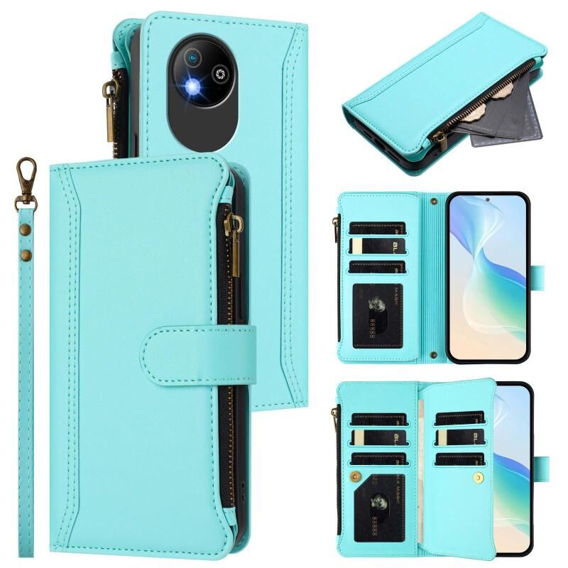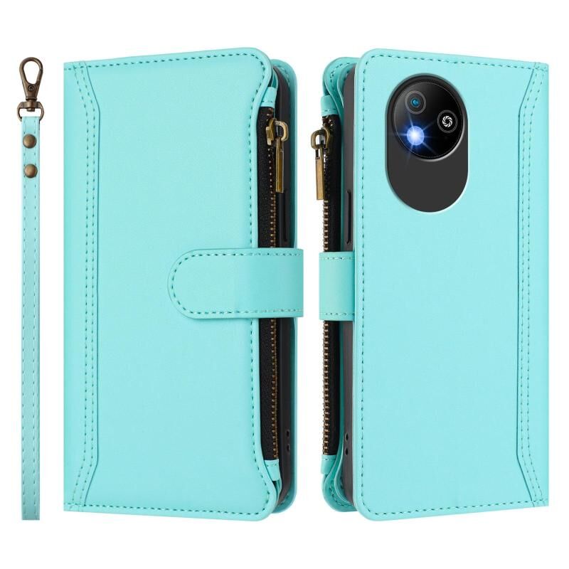 For ZTE Blade A35 Lite / A35 Core Magnetic Closure 9 Card Slots Zipper Leather Case with Hand Strap(Mint Green)