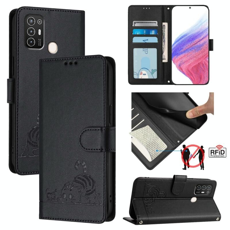 For ZTE Blade A52 Cat Rat Embossed Pattern RFID Leather Phone Case with Lanyard(Black)