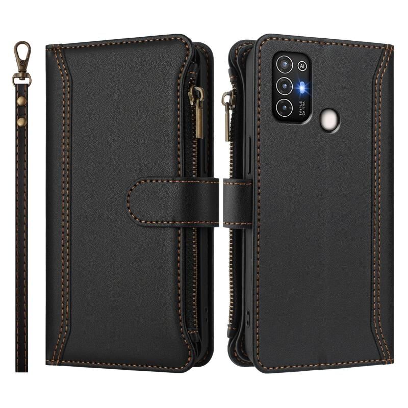 For ZTE Blade A52 Magnetic Closure 9 Card Slots Zipper Leather Case with Hand Strap(Black)