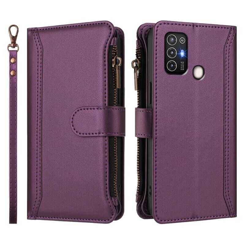 For ZTE Blade A52 Magnetic Closure 9 Card Slots Zipper Leather Case with Hand Strap(Purple)