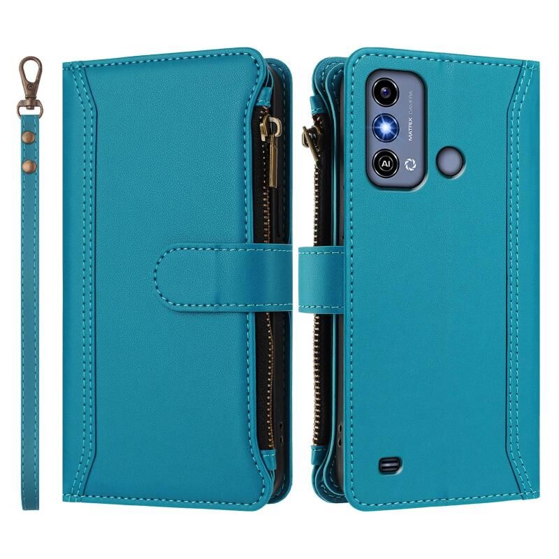 For ZTE Blade A53 / A53+ Magnetic Closure 9 Card Slots Zipper Leather Case with Hand Strap(Turquoise)